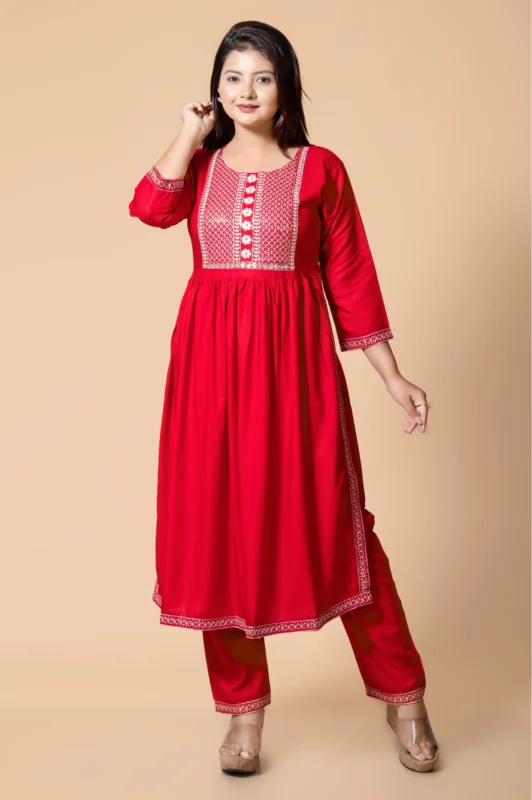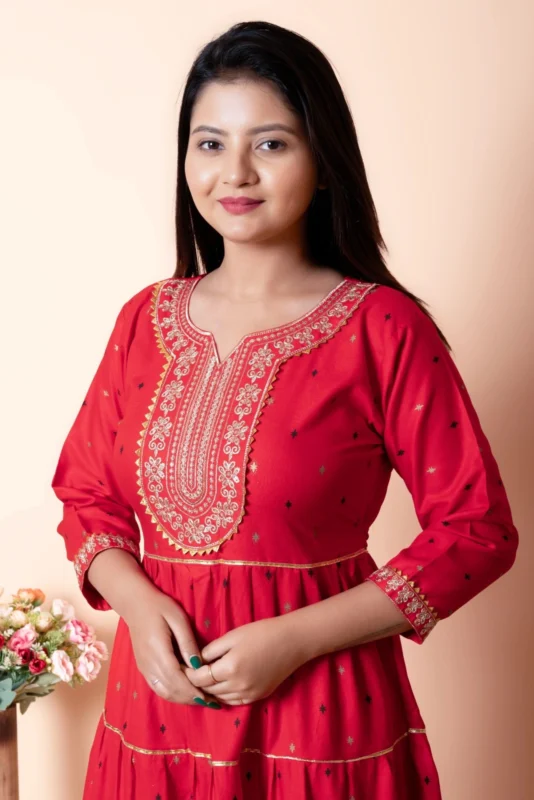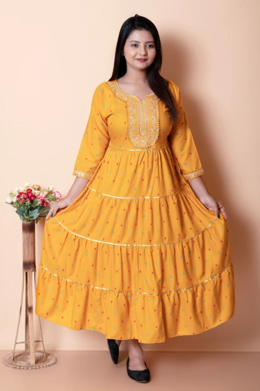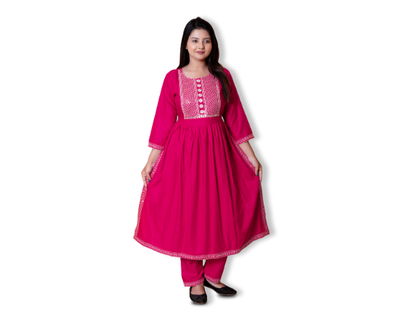 Kurthit gowns are made from premium viscose rayon fabric, which is soft, breathable, lightweight, and comfortable for long hours. The fabric gives a smooth and elegant fall, perfect for festive and occasion wear.